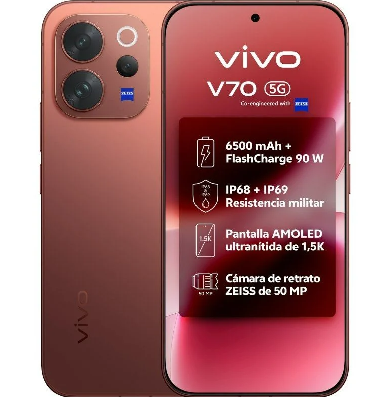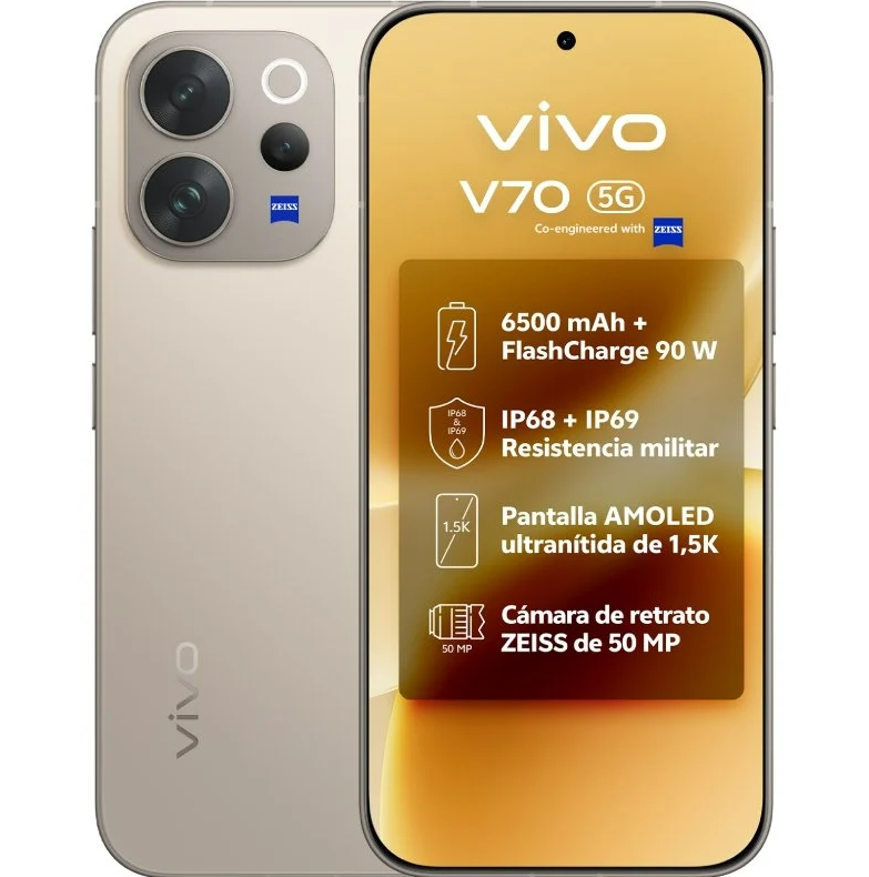 V70 / 6,59" AMOLED 120 Hz / Snapdragon 7 Gen 4 / 8GB + 512GB / Cámaras ZEISS 50 MP / 6500 mAh / 90 W / Android 16