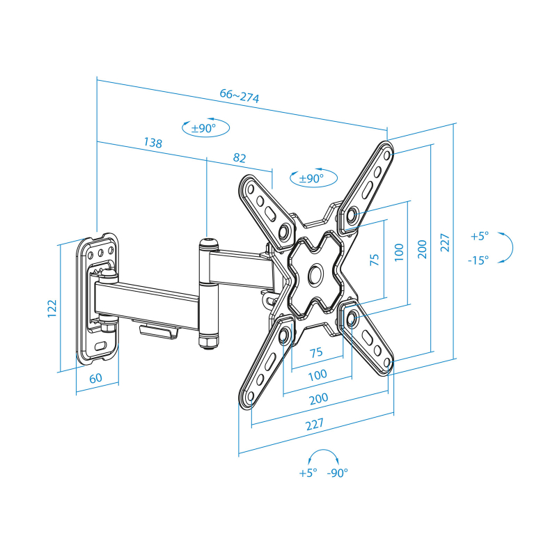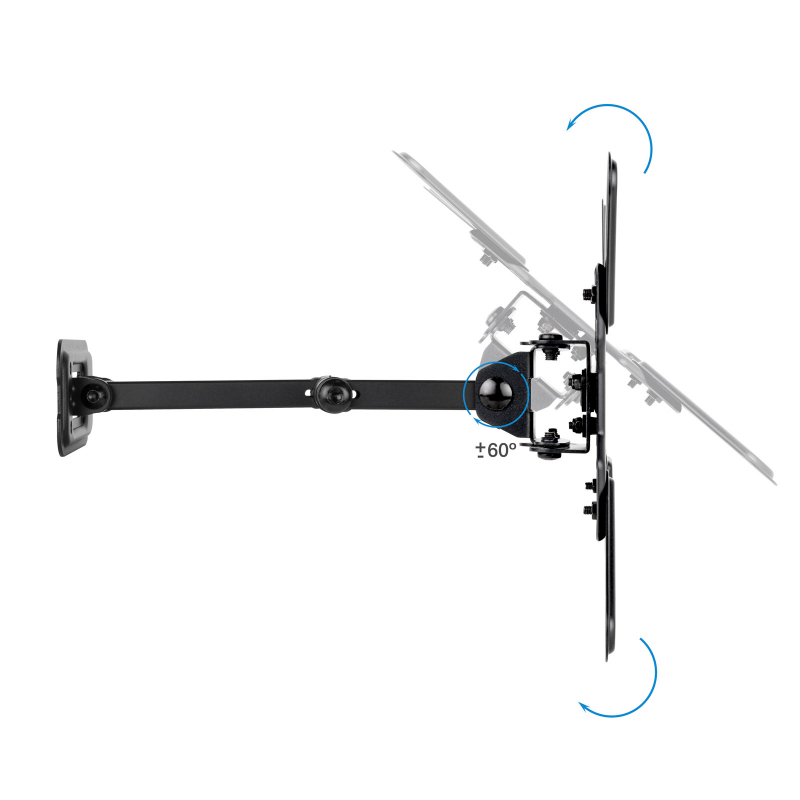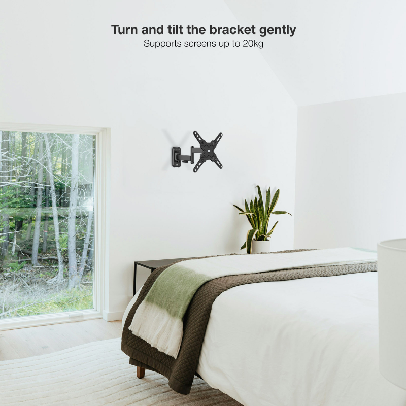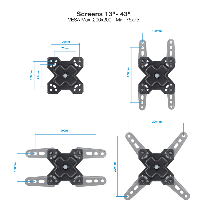 13"-43"/ Inclinación, giro, rotación/ Peso máximo 20KG/ VESA máximo 200x200mm/ Brazo articulado
