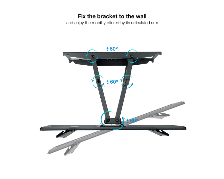 37-80"/ Máximo 40kg/ VESA Máximo 600x400/ Inclinación, giro y nivelación/ Distancia de pared de 67 a 355mm