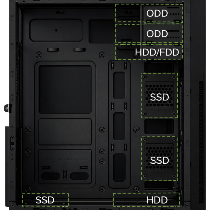 ATX / Cooler CPU 140 mm / 3×SSD + 1×HDD / USBC + USB 3.0 + USB 2.0 / Fuente 500W 80+