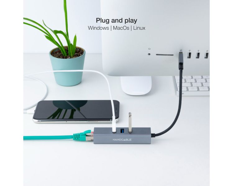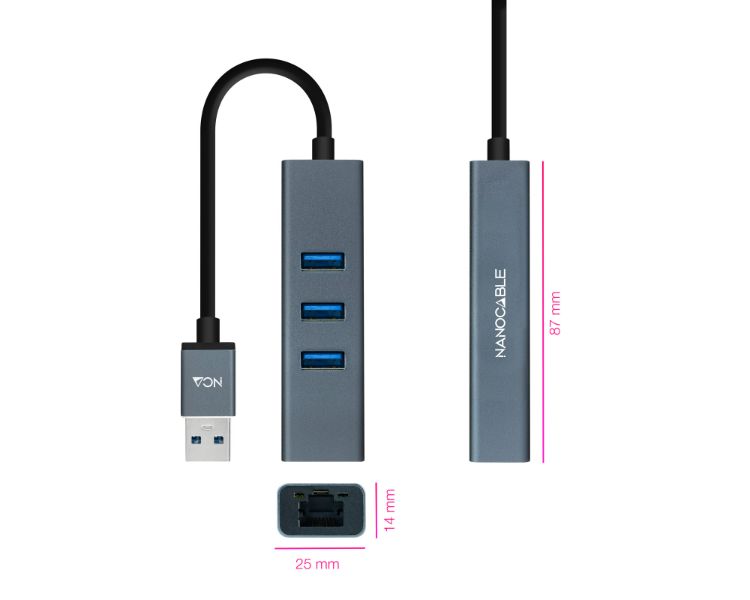 CONVERSOR USB 3.0 A ETHERNET GIGABIT + 3xUSB 3.0 15cm GRIS NANOCABLE